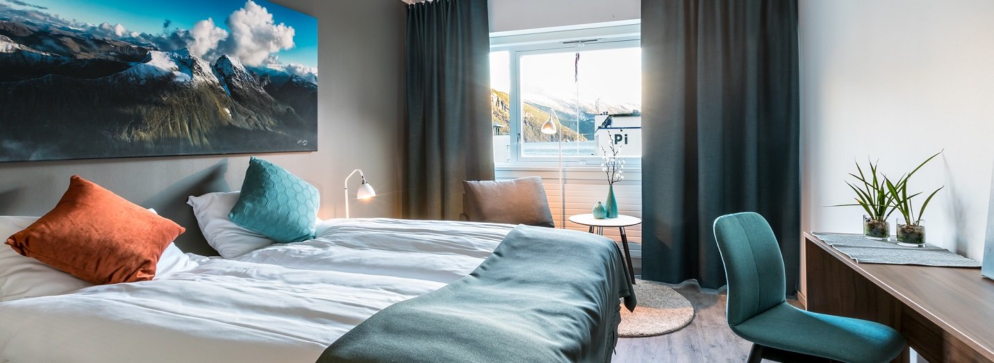 Alle Twinrom har eget bad, seng og skrivepult med stol, i tillegg til en liten plass å sitte (hvilestol og bord).
